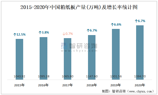 2015-2020年中國箱紙板產量及增長率統計圖