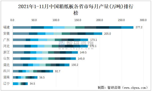2021年1-11月中國箱紙板各省市每月產量排行榜