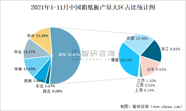 2021年1-11月中國箱紙板產量大區占比統計圖