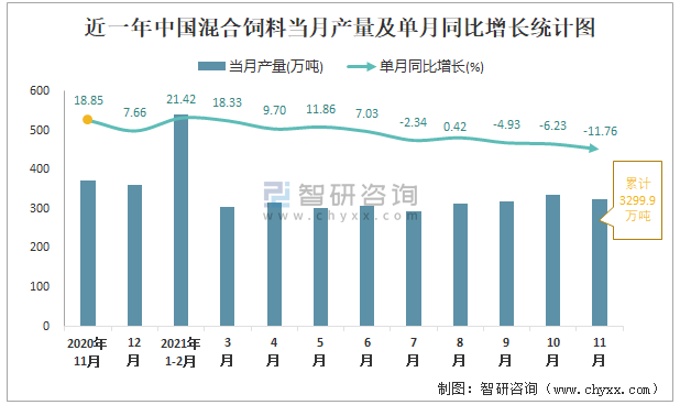 根據國家統計局數據顯示:2021年11月中國混合飼料產量為325萬噸,同比下降11.76%;2021年1-11月中國混合飼料累計產量為3299.9萬噸,同比增長2.73%;2015-2020年中國混合飼料產量2019年跌至最低,次年有所回升。