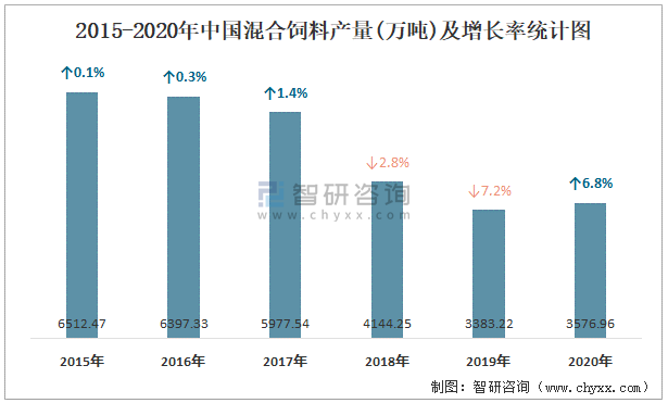 2015-2020年中國混合飼料產量及增長率統計圖