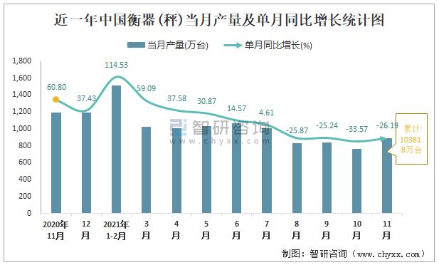 根據(jù)國家統(tǒng)計(jì)局?jǐn)?shù)據(jù)顯示:2021年11月中國衡器(秤)產(chǎn)量為887萬臺(tái),同比下降26.19%;2021年1-11月中國衡器(秤)累計(jì)產(chǎn)量為10381.8萬臺(tái),同比增長10.42%;2015-2020年中國衡器(秤)產(chǎn)量總體呈上升趨勢,2020年達(dá)到最高。