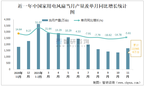 根據國家統計局數據顯示:2021年11月中國家用電風扇產量為1689萬臺,同比下降5.61%;2021年1-11月中國家用電風扇累計產量為22360.6萬臺,同比增長4.59%;2015-2020年中國家用電風扇產量逐年遞增,2020年達到最高。