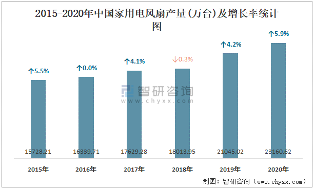 2015-2020年中國家用電風扇產量及增長率統計圖