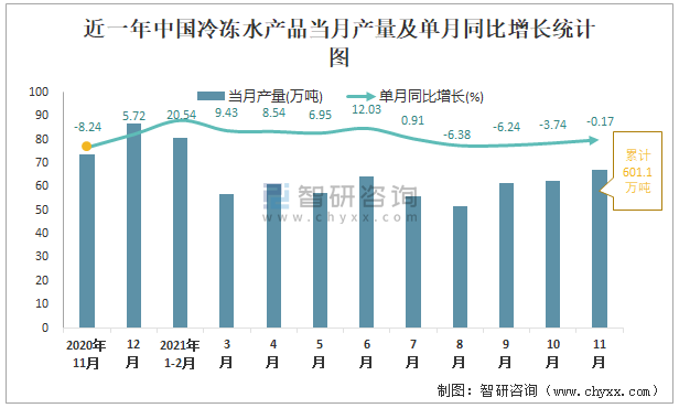 根據(jù)國家統(tǒng)計局數(shù)據(jù)顯示:2021年11月中國冷凍水產(chǎn)品產(chǎn)量為67.1萬噸,同比下降0.17%;2021年1-11月中國冷凍水產(chǎn)品累計產(chǎn)量為601.1萬噸,同比增長5.06%;2015-2020年中國冷凍水產(chǎn)品產(chǎn)量2018年跌至最低,次年有所回升。