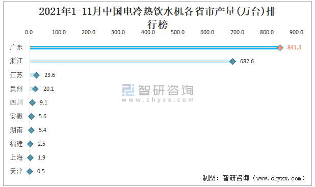 2021年1-11月中國電冷熱飲水機各省市產量排行榜