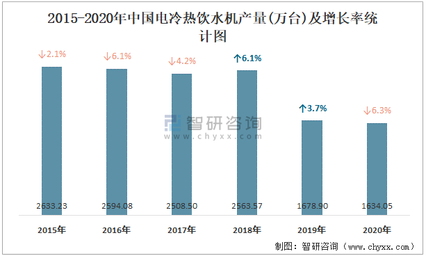 2015-2020年中國電冷熱飲水機產量及增長率統計圖