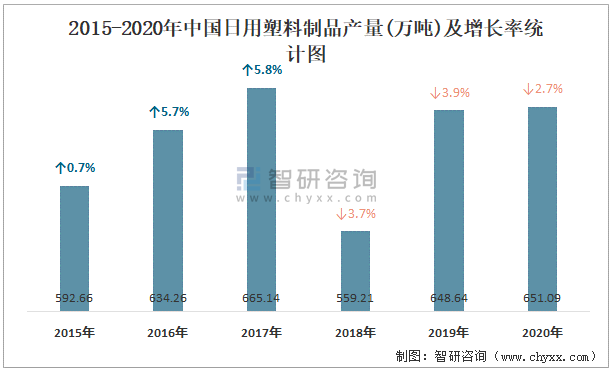 2015-2020年中國日用塑料制品產量及增長率統計圖