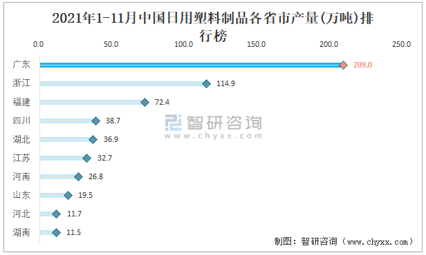 2021年1-11月中國日用塑料制品各省市產量排行榜