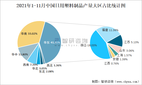 2021年1-11月中國日用塑料制品產量為637.4萬噸 華東地區產量最高(占比41.31%)
