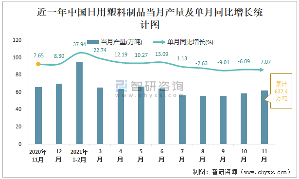 根據國家統計局數據顯示:2021年11月中國日用塑料制品產量為62萬噸,同比下降7.07%;2021年1-11月中國日用塑料制品累計產量為637.4萬噸,同比增長8.24%;2015-2020年中國日用塑料制品產量2018年跌至最低,此后逐年遞增。