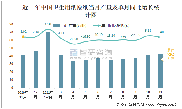 根據國家統計局數據顯示:2021年11月中國衛生用紙原紙產量為42.7萬噸,同比增長0.4%;2021年1-11月中國衛生用紙原紙累計產量為409.5萬噸,同比下降3.41%;2015-2020年中國衛生用紙原紙產量2019年達到最高,次年有所下滑。