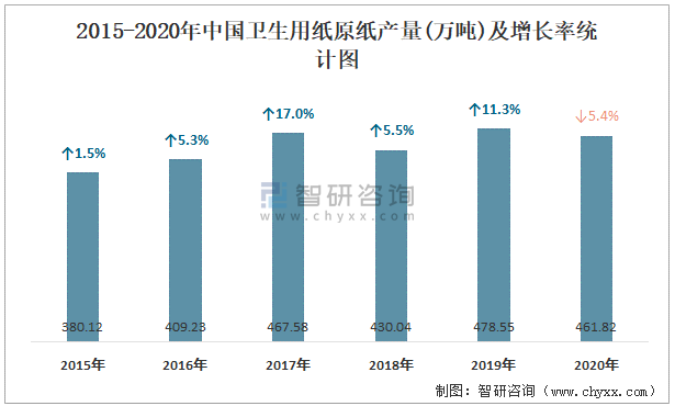 2015-2020年中國衛生用紙原紙產量及增長率統計圖