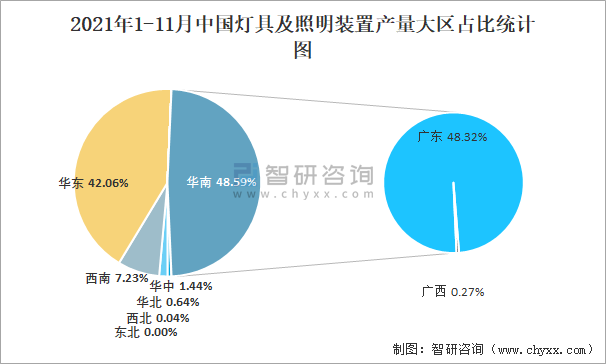 2021年1-11月中國燈具及照明裝置產(chǎn)量為50億套(臺、個) 華南地區(qū)產(chǎn)量最高(占比48.59%)