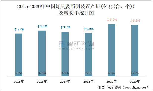 2015-2020年中國燈具及照明裝置產(chǎn)量及增長率統(tǒng)計(jì)圖