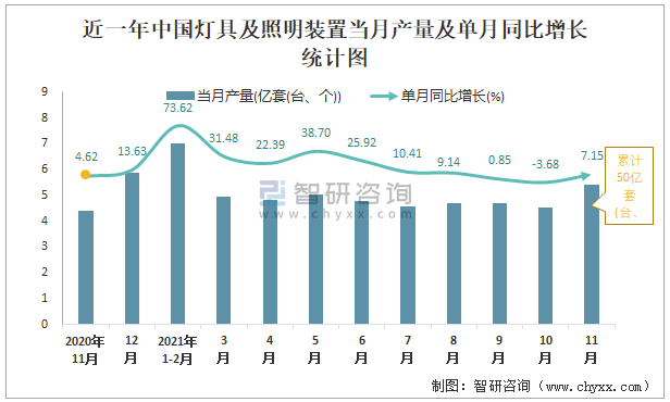 根據(jù)國家統(tǒng)計(jì)局?jǐn)?shù)據(jù)顯示:2021年11月中國燈具及照明裝置產(chǎn)量為5.4億套(臺、個),同比增長7.15%;2021年1-11月中國燈具及照明裝置累計(jì)產(chǎn)量為50億套(臺、個),同比增長22.91%;2015-2020年中國燈具及照明裝置產(chǎn)量2019年達(dá)到最高,次年出現(xiàn)小幅度下滑。