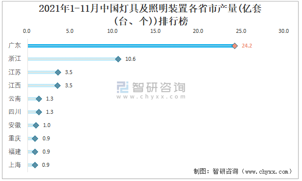 2021年1-11月中國燈具及照明裝置各省市產(chǎn)量排行榜