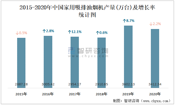 2015-2020年中國家用吸排油煙機產量及增長率統計圖
