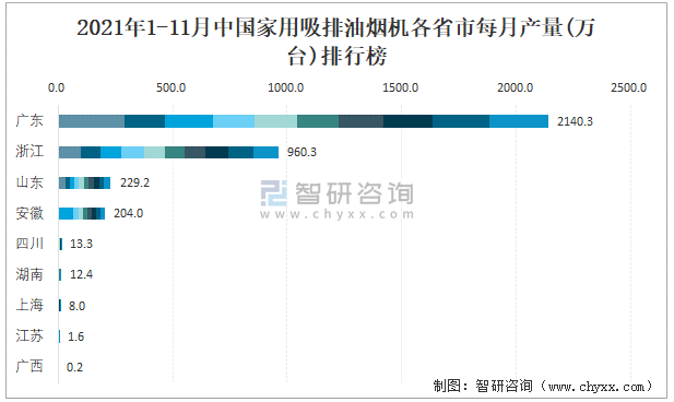2021年1-11月中國家用吸排油煙機各省市每月產量排行榜