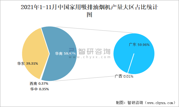 2021年1-11月中國家用吸排油煙機產量大區占比統計圖