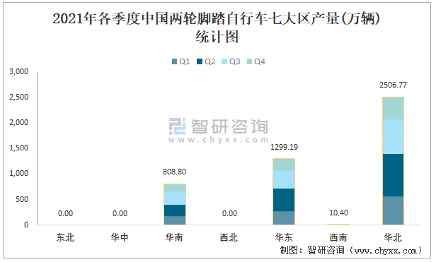 2021年各季度中國兩輪腳踏自行車七大區產量統計圖