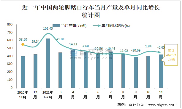 根據國家統計局數據顯示:2021年11月中國兩輪腳踏自行車產量為421萬輛,同比下降3.65%;2021年1-11月中國兩輪腳踏自行車累計產量為4625.2萬輛,同比增長4.22%;2015-2020年中國兩輪腳踏自行車產量2019年跌至最低,次年有所回升。