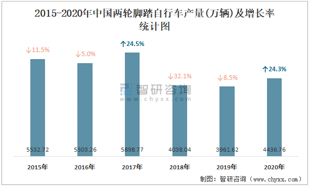 2015-2020年中國兩輪腳踏自行車產量及增長率統計圖
