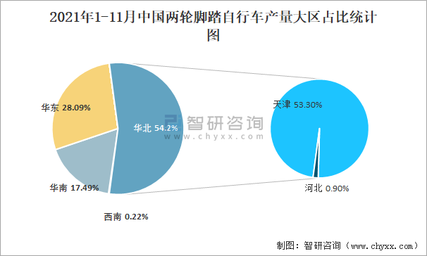 2021年1-11月中國兩輪腳踏自行車產量大區占比統計圖