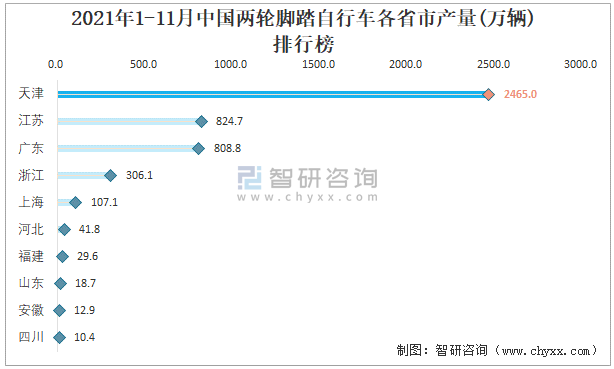 2021年1-11月中國兩輪腳踏自行車各省市產量排行榜