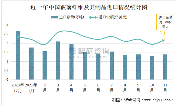 根據中國海關數據顯示:2021年11月中國玻璃纖維及其制品進口數量為1.39萬噸,同比下降55.4%,進口金額為0.88億美元,同比增長4.8%,2021年1-11月中國玻璃纖維及其制品進口數量為17.28萬噸,進口金額為9.94億美元。