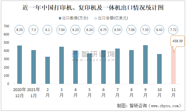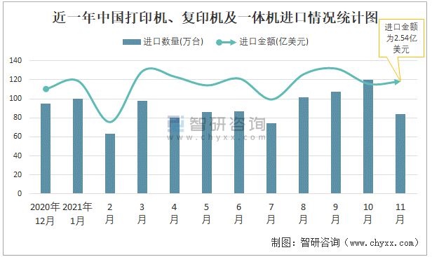 根據(jù)中國海關(guān)數(shù)據(jù)顯示:2021年11月中國打印機(jī)、復(fù)印機(jī)及一體機(jī)進(jìn)口數(shù)量為84.14萬臺(tái),同比下降8.8%,進(jìn)口金額為2.54億美元,同比增長5%,2021年11月中國打印機(jī)、復(fù)印機(jī)及一體機(jī)出口數(shù)量為458.39萬臺(tái),同比下降1.4%,出口金額為7.72億美元,同比下降1.6%;2021年1-11月中國打印機(jī)、復(fù)印機(jī)及一體機(jī)進(jìn)口數(shù)量為1000.58萬臺(tái),進(jìn)口金額為27.33億美元,出口數(shù)量為4504.07萬臺(tái),出口金額為74.72億美元。