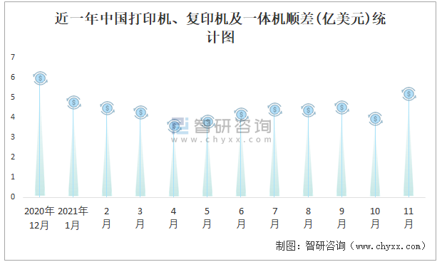近一年中國打印機(jī)、復(fù)印機(jī)及一體機(jī)順差(億美元)統(tǒng)計(jì)圖