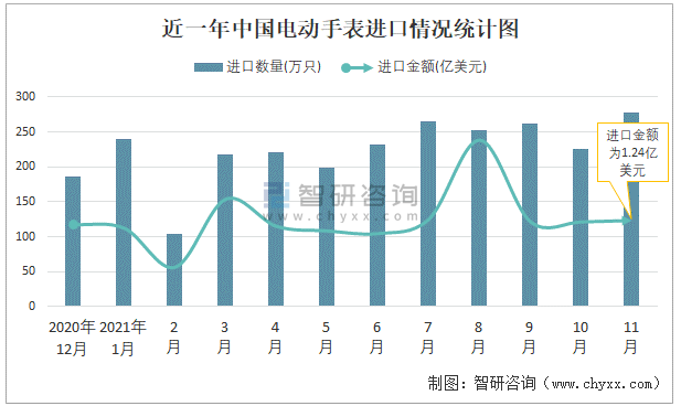 根據(jù)中國(guó)海關(guān)數(shù)據(jù)顯示:2021年11月中國(guó)電動(dòng)手表進(jìn)口數(shù)量為277萬只,同比增長(zhǎng)46%,進(jìn)口金額為1.24億美元,同比下降6.1%,2021年1-11月中國(guó)電動(dòng)手表進(jìn)口數(shù)量為2496萬只,進(jìn)口金額為13.86億美元。