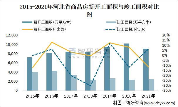 2015-2021年河北省商品房新開工面積與竣工面積對比圖