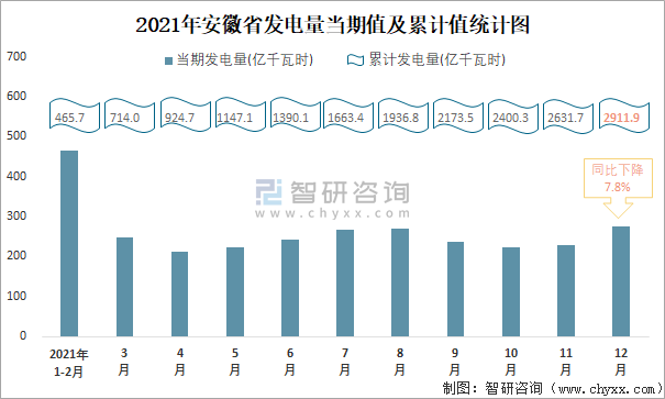 根據國家統計局數據統計可知:2021年12月安徽省發電量為276.4億千瓦時,同比下降7.8%,2021年1-12月安徽省發電量為2911.9億千瓦時,累計增長7.9%;2021年1-12月安徽省主要有4種類型發電量,發電量占全國比重約為3.59%,其中火力發電量為2690.3億千瓦時,占安徽省發電量比重約為92.39%,占全國發電量比重約為3.32%,是安徽省最大發電量類型,目前安徽省暫無核能發電量。