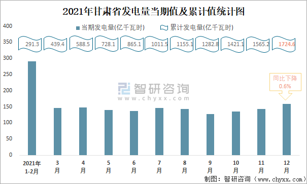 2021年甘肅省發(fā)電量當(dāng)期值及累計值統(tǒng)計圖