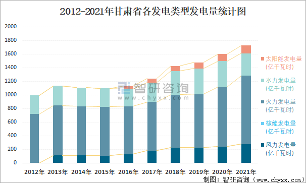 2012-2021年甘肅省各發(fā)電類型發(fā)電量統(tǒng)計圖