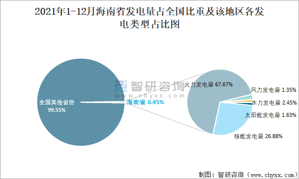 2021年1-12月海南省發電量占全國比重及該地區各發電類型占比圖