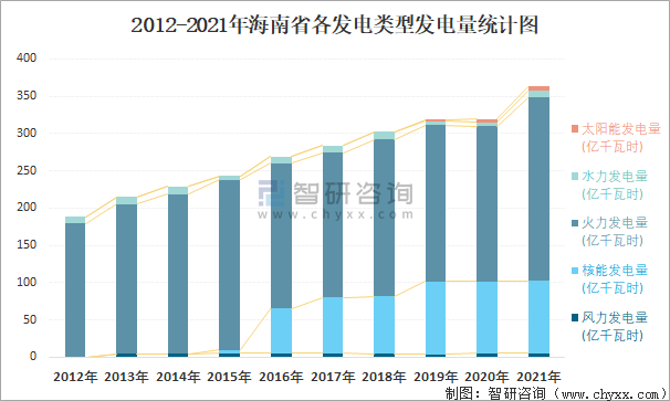 2012-2021年海南省各發電類型發電量統計圖