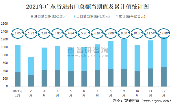 2021年1-12月廣東省進出口總額為12.8千億美元,累計同比增長25%