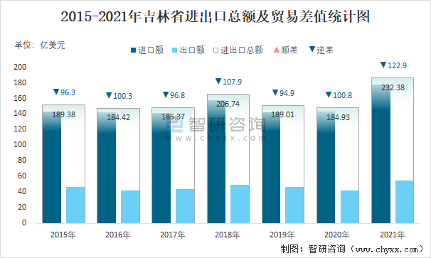 2015-2021年吉林省進出口總額及貿易差值統計圖