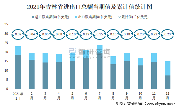2021年1-12月吉林省進出口總額為0.23千億美元,累計同比增長25.4%