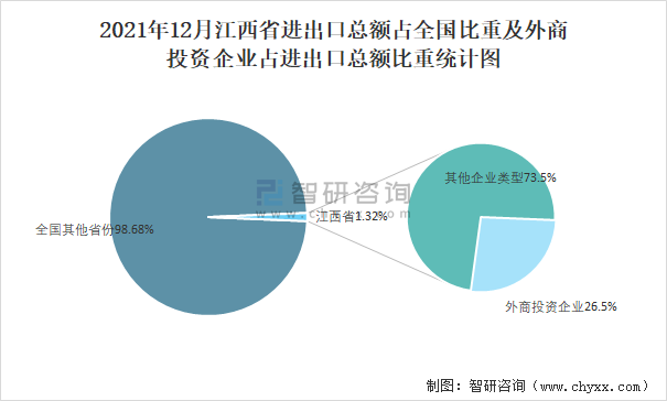2021年12月江西省進出口總額占全國比重及外商投資企業(yè)占進出口總額比重統(tǒng)計圖