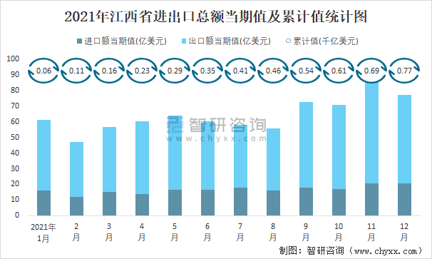 2021年江西省進出口總額當期值及累計值統(tǒng)計圖
