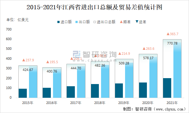 2015-2021年江西省進出口總額及貿(mào)易差值統(tǒng)計圖