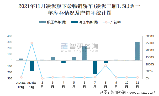 2021年11月凌派旗下最暢銷車(凌派三廂1.5L)近一年庫存情況及產(chǎn)銷率統(tǒng)計圖