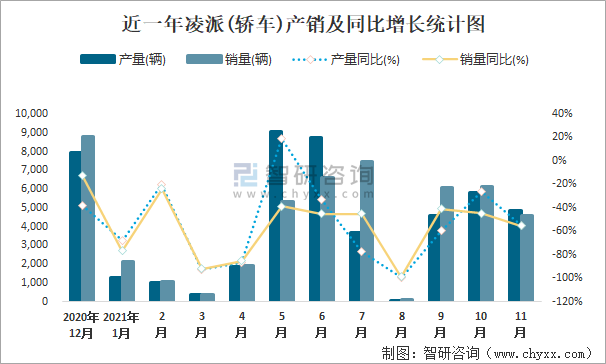 近一年凌派(轎車)產(chǎn)銷及同比增長統(tǒng)計圖