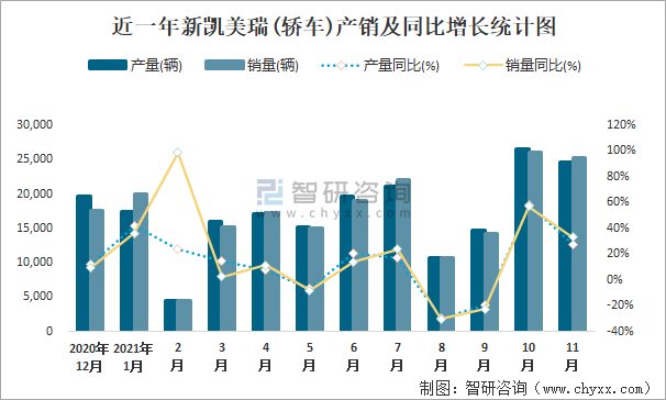 近一年新凱美瑞(轎車)產銷及同比增長統計圖
