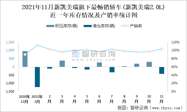 2021年11月新凱美瑞旗下最暢銷車(新凱美瑞2.0L)近一年庫存情況及產銷率統計圖