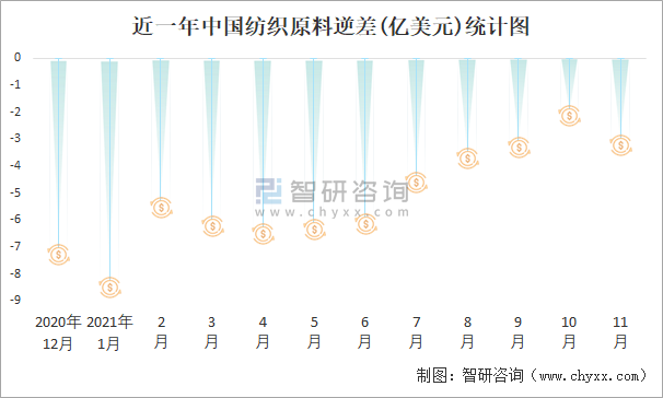 近一年中國紡織原料逆差(億美元)統計圖